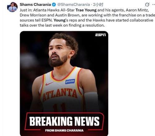 原文如下:据ESPN消息人士透露,亚特兰大老鹰队全明星球员特雷·杨及其经纪人阿隆·明茨、德鲁·莫里森和奥斯汀·布朗正在与球队商讨交易事宜。杨的经纪人和老鹰队已于上周开始进行合作谈判,力求找到解决方案。