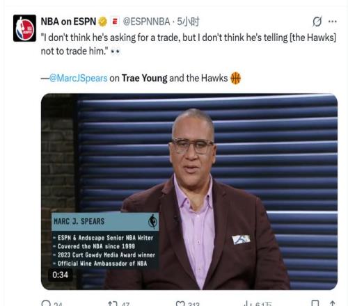 之后另外一位大记者Marc Stein跟进报道,过去一周老鹰已经和多支球队谈判一直在主动推进特雷-杨的交易,他们想争取在交易截止日高峰期前将杨送走。