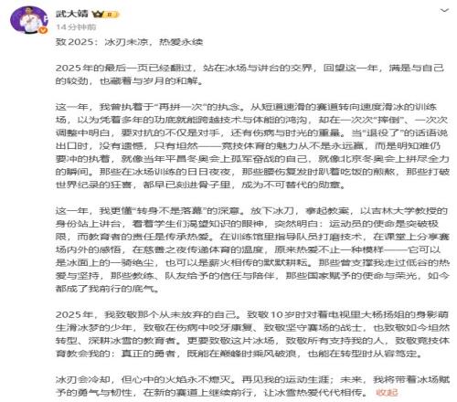 2025年,我致敬那个从未放弃的自己。致敬10岁时对着电视里大杨扬姐的身影萌生滑冰梦的少年,致敬在伤病中咬牙康复、致敬坚守赛场的战士,也致敬如今坦然转型、深耕冰雪的教育者。更要致敬这片冰场,致敬所有支持我的人,致敬竞技体育教会我的:真正的勇者,既能在巅峰时乘风破浪,也能在转型时从容笃定。